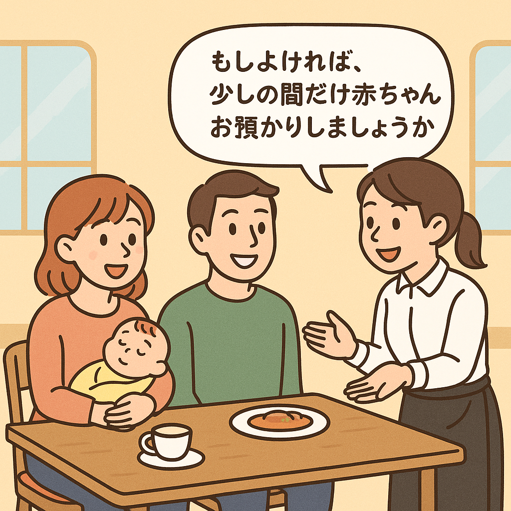 「もしよければ、少しの間だけ赤ちゃんをお預かりしましょうか?」