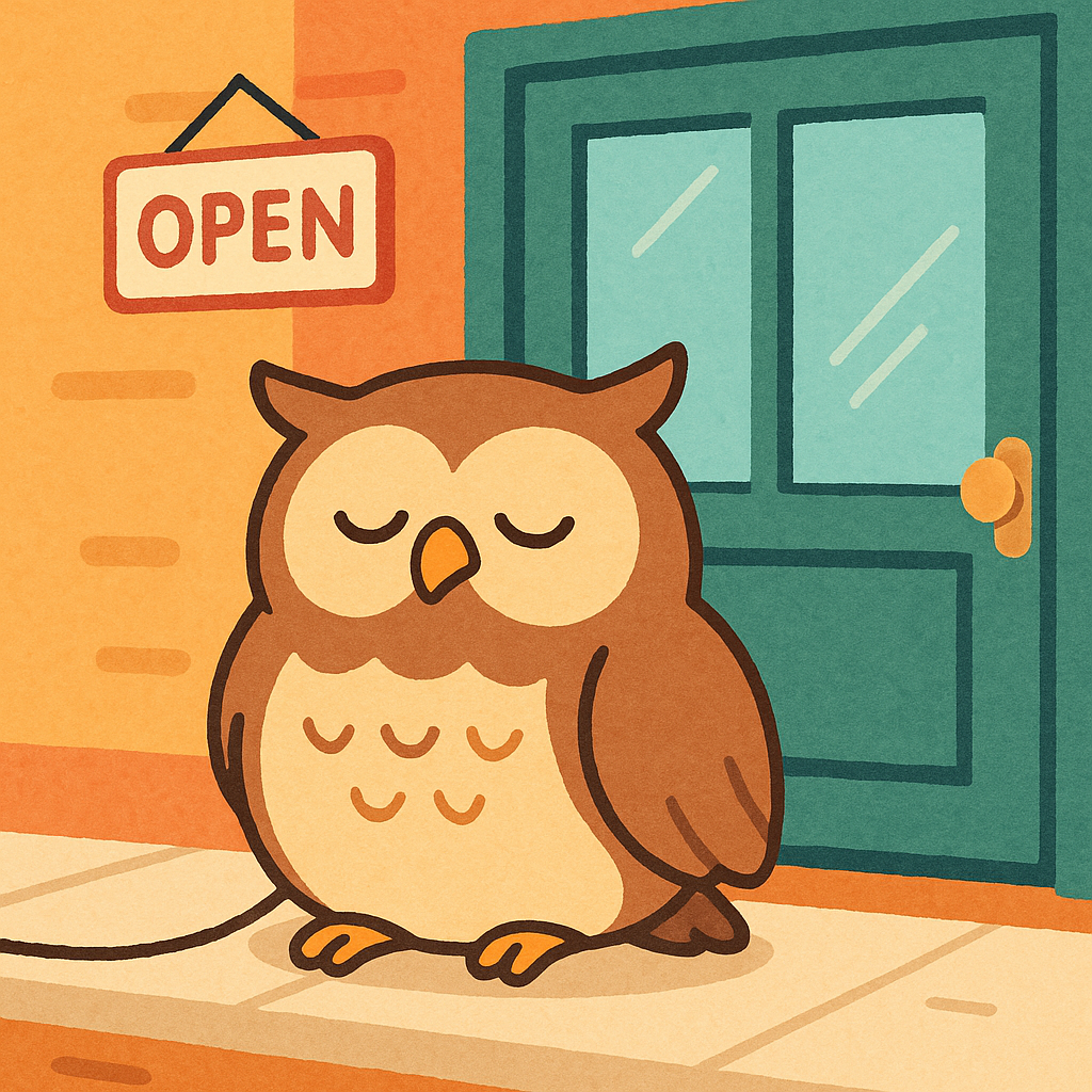 散歩の途中、飲食店の前でぽつんと座っているフクロウを見つけました。